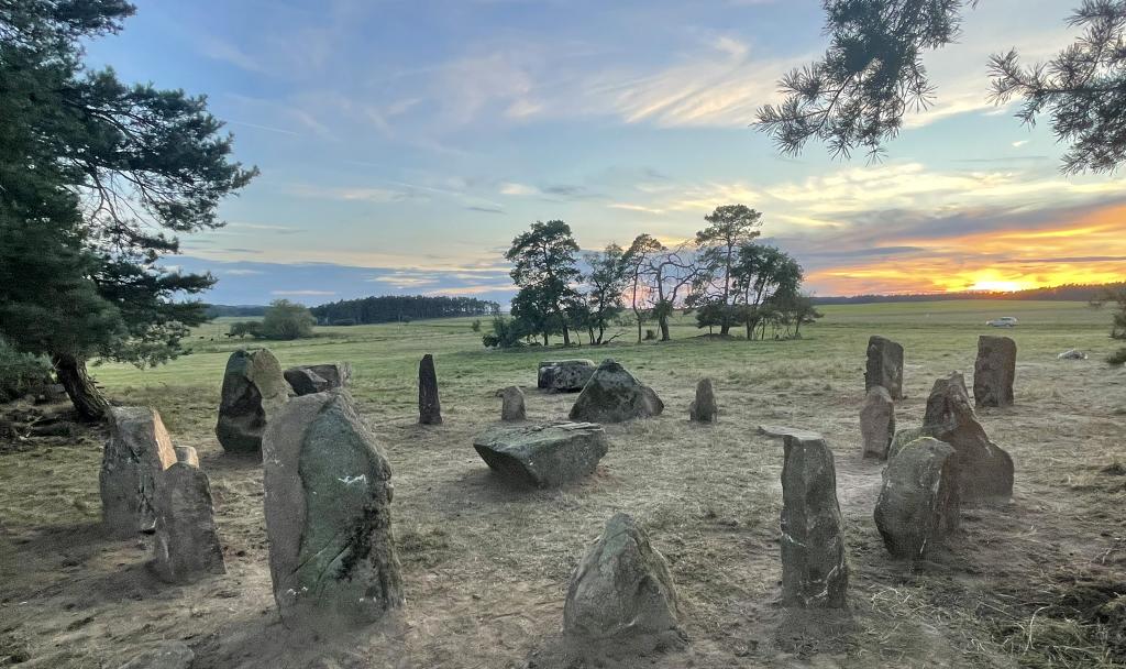 Tři kamenné kruhy jsou zde doplněny dalšími kamennými a krajinotvornými stavbami, jejichž účelem je harmonie krajiny a práce s energií.
